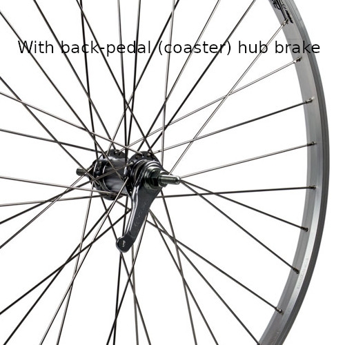 Some of the rear wheels include back-pedal brakes, also sometimes known as coaster brakes. These allow braking with the rear wheel by turning the pedals backwards slightly. Note that in many countries it is a legal requirement to have two completely independent braking systems on a bicycle and that therefore a bicycle which has only a back pedal brake is illegal. We offer a low cost set of parts to add a front wheel brake to most such bicycles. Some photos may show a sprocket already attached to these wheels, but one will not necessarily be delivered with the wheel. We have different suppliers and some batches of wheels include sprockets while others do not. Suitable sprockets are available separately - you can pick a size depending on the gear ratios required.